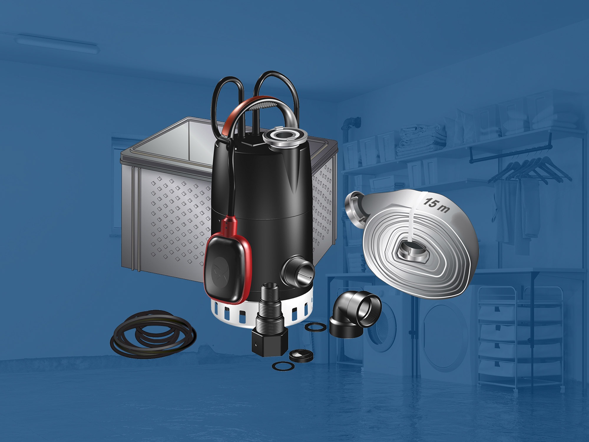 Frühzeitiges und besonnenes Reagieren minimiert größere Sachschäden erheblich: Vorausgesetzt man hat im Notfall die dafür notwendige Ausrüstung griffbereit zur Hand. Mit der MULTIBOX können Sie im Krisenfall schnell und entschlossen reagieren, wenn Ihr Keller unter Wasser steht. Denn sie beinhaltet neben der flachsaugenden Schmutzwasserpumpe UNILIFT CC alle notwendigen Schläuche und Materialien für eine schnelle Kellerentwässerung.
